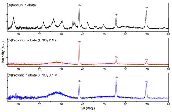 Figure 2b,c exhibits the XRD diffractograms of the samples obtained after the ion exchange procedure with 2 M and 0.1 M HNO3, respectively, which correspond to protonic niobate (H3O)2Nb2O6·H2O []. Despite the clear distinction that could be observed compared with sodium niobate (Figure 2a), no significant structural differences were noted between the samples treated with different nitric acid concentrations (2 M and 0.1 M). The absence of well-defined peaks after immersion in HNO3 at both concentrations suggested that the treatment led to the collapse of the crystalline structure. The undulation between 25° and 30° of the protonic niobate samples indicated the presence of a fraction of crystalline material coexisting with a largely disordered phase, which could have led to the merging or broadening of the original peaks, resulting in the observed diffraction profile.