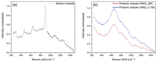 The spectra of niobate after ion exchange in 2 M HNO3 solution (Figure 8b) and 0.1 M HNO3 solution (Figure 8c) revealed significant changes in the vibrational profile of the material’s structure. In both spectra, the presence of water was observed, with peaks at 3266 cm−1 and 1625 cm−1 for the 0.1 M sample and at 3288 cm−1 and 1635 cm−1 for the 2 M sample. Both samples displayed the same vibration profile in the oxygen–niobium bonding region, with shoulders around 900 cm−1 and less-defined peaks between 571 and 555 cm−1. Compared to the original sodium niobate, the vibrations that were previously more energetic and well defined were replaced by less-defined, lower-energy peaks, with a reduction in the previously existing vibrational modes.