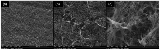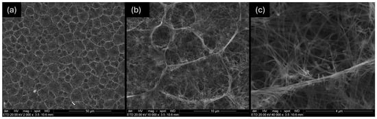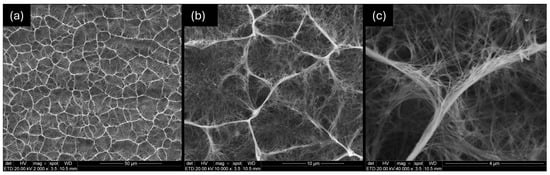 FEG-SEM images of protonic niobate obtained after ionic exchange in 0.1 M HNO3: (a) magnification 2000×; (b) magnification 10,000×; (c) magnification 40,000×.