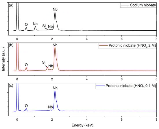 EDS analysis: (a) sodium niobate; (b) protonic niobate (2 M HNO3); (c) protonic niobate (0.1 M HNO3).