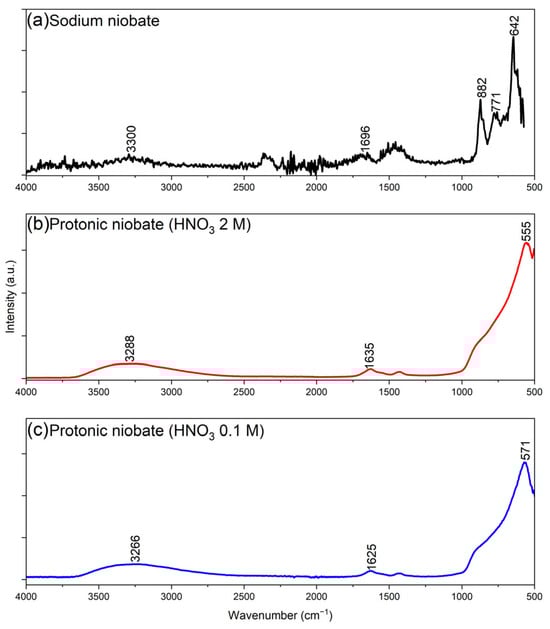 ATR-FTIR results: (a) sodium niobate; (b) protonic niobate (2 M HNO3); (c) protonic niobate (0.1 M HNO3).