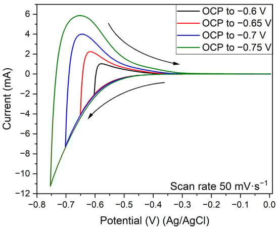 Figure 9 presents the cyclic voltammetry results of protonic niobate (HNO3 2 M) in 1 M H2SO4 as the electrolyte for different potential windows. It was verified that slight hydrogen evolution began in the potential window from 0 V to −0.75 V. Thus, the potential window selected for this sample was 0 V to −0.7 V (vs. Ag/AgCl).
