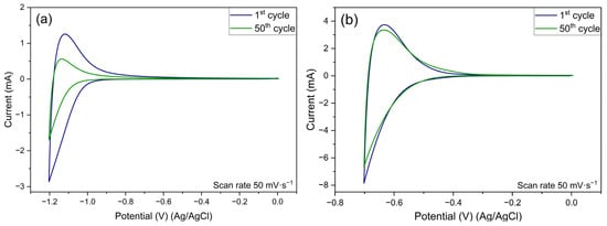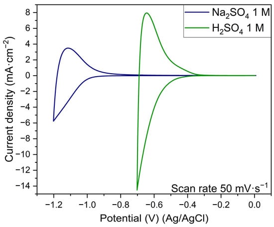 First, the influence of the electrolyte was evaluated. For this purpose, two aqueous electrolytes were used: 1 M sodium sulfate Na2SO4 (Merck, Darmstadt, Germany) and 1 M sulfuric acid H2SO4 (Merck, Darmstadt, Germany). Protonic niobate electrodes were tested as cathodes, as proposed by Upadhyay et al. [] and Santos et al. []. In our previous work, it was demonstrated that for protonic niobate, the suitable potential window for 1 M Na2SO4 electrolyte is 0 to −1.2 V (versus Ag/AgCl) []. To verify the operational potential window (maximum potential where hydrogen evolution does not occur) of the protonic niobates in 1 M H2SO4, potentiodynamic cyclic voltammetry tests were performed at a 50 mV·s−1 scan rate in increments in the potential window in the cathodic direction. Three scans were performed for each condition, and the third scan is shown in the results. Then, for both electrolytes, cyclic voltammetry tests were performed with 50 scan cycles in the useful potential window at a 50 mV·s−1 scan rate to verify the reversibility of the electrochemical phenomena resulting from polarization.