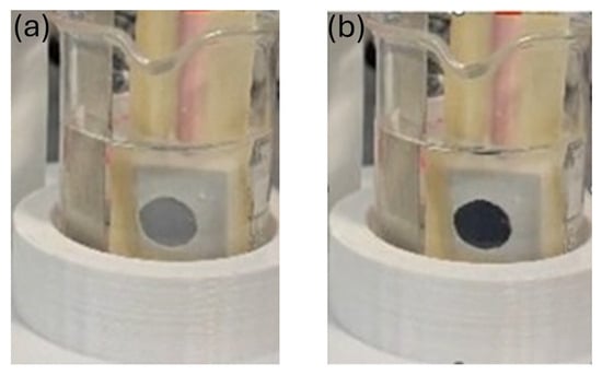 Regarding the response in acidic electrolytes, Gomes et al. [] investigated the electrochemical behavior of niobium pentoxide (Nb2O5) in an acidic medium (0.2 M H2SO4). For this purpose, cyclic voltammetry tests were performed in the cathodic direction up to −1.45 V (versus Hg/Hg2SO4). According to the authors, during the scan, Nb5+ reduced to Nb4+, and simultaneously the intercalation of H+ ions occurred inside the oxide, which formed a bond with the O2− of the oxide; therefore, the electron injection and intercalation of the H+ ions occurred. Furthermore, the study reported a change in the color of the Nb2O5 oxide when polarized, changing from white to dark blue. The same behavior was found for the protonic niobate (2 M HNO3) when polarized in the cathodic direction, returning to its original white color when the polarization was reversed, as can be seen in Figure 11. This macroscopic similarity in the electrochemical behavior of Nb2O5 and the samples in the present work indicated that the reactions occurring in the protonic niobate samples were similar to those occurring in niobium pentoxide, despite the materials having different compositions and crystalline structures [,].