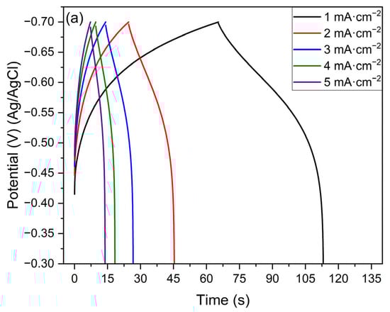 The systems that presented the best performance in terms of current density response in the potentiodynamic cyclic voltammetry tests were subjected to galvanostatic charge and discharge (GCD) tests to determine the capacitance, which was calculated according to Equation (1) []. In the samples where this value was significant, tests were performed at different current densities (from 1 to 10 mA·cm−2). Then, a current density was selected, and successive charge and discharge cycles were performed to evaluate the reversibility of the protonic niobate.
