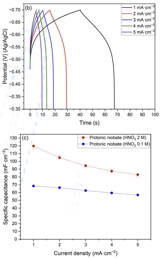 The specific capacitance achieved with protonic niobate obtained with 2 M HNO3 was better than that obtained by Upadhyay et al. [], who achieved a specific capacitance of 100 mF·cm−2 for 1 mA·cm−2 and approximately 70 mF·cm−2 for 5 mA·cm−2. Even compared to other works that used niobium-containing materials and a M H2SO4 as the electrolyte, the results obtained in the present work are also better, since Gao et al. [] obtained approximately 30 mF·cm−2 for 1 mA·cm−2 for a niobium nitride nanobelt array, and Pacheco et al. [] achieved 103 mF·cm−2 for 1 mA·cm−2.
