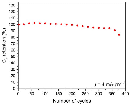 As shown in Figure 14, the protonic niobate sample obtained with 2 M HNO3 achieved excellent reversibility, maintaining the same specific capacitance after several consecutive cycles. However, this good retention of capacitance was only maintained up to approximately 350 cycles. After this number of charges and discharges, hydrogen evolution began, causing the sample to lose its ability to reach the predetermined potential value, until it completely lost this capacity.