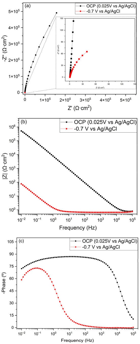 Electrochemical impedance spectroscopy (EIS) measurements of protonic niobate (2 m HNO3) in 1 M H2SO4 electrolyte at open circuit potential (OCP) and at −0.7 V versus Ag/AgCl: (a) Nyquist plot; (b,c) Bode plots.