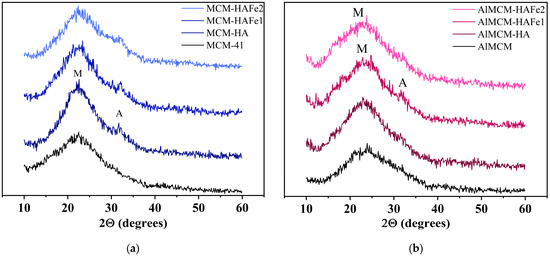 XRD data on HA, HAFe1, and HAFe2 powders deposited on either (a) MCM-41 or (b) AlMCM as well as pure MCM-41 and AlMCM materials, where M denotes silicate, and A denotes apatite phases.