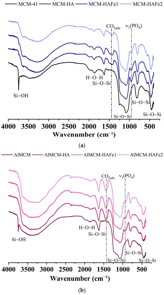 The presented IR spectra (Figure 2) clearly show the main peaks characteristic of vibrations of silicon dioxide mesh in the regions of 460, 805, and 1200–1080 cm−1 [51]. When HA/HAFe was deposited on the MCM-41 matrix, the ν1 (PO4) vibration peak at 960–962 cm−1 as well as a substantial amount of adsorbed CO2 (intense vibration in the region of 1480 cm−1) were evident in the MCM-41 matrix. The main peak of the phosphate group in the 1200–1000 cm−1 region strongly overlaps with an intense peak of O-Si-O vibrations. Another characteristic region for phosphate is 650–550 cm−1, in which the presence of more intense bands should also be seen (and was), compared to the support material without the deposition. Of interest is the hydroxyl peak at 3745 cm−1, which is characteristic of MCM-41 [53]. This band is associated with the silanol group, which is located at the edges of MCM-41 particles. After the deposition of the apatite phase on the surface of the support, the intensity of these vibrations dropped sharply, possibly indicating the presence of chemical bonding between silanol groups and deposited HA/HAFe.