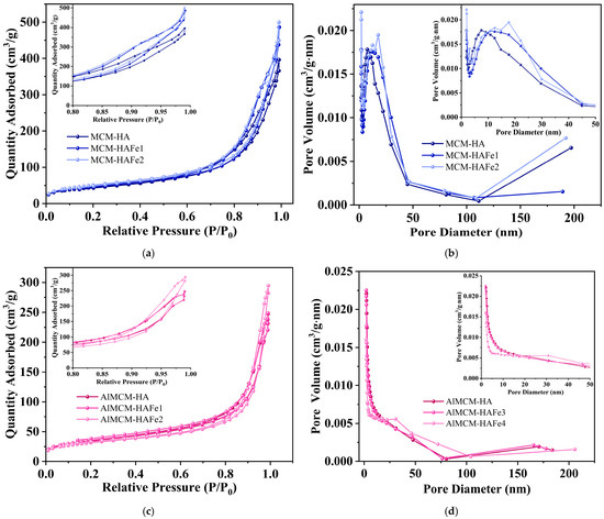 Adsorption–desorption isotherms and pore size distributions of HA, HAFe1, and HAFe2 powders deposited on either MCM-41 (a,b) or AlMCM (c,d).