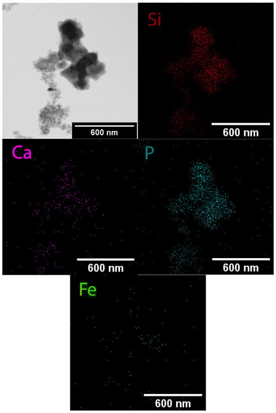 Mapping-mode imaging confirmed the emergence of calcium phosphate on the surface of MCM-41 (Figure 5). Silicon, calcium, phosphorus, and iron were found to be uniformly distributed on the whole surface of the examined particles. These findings mean the absence of the formation of separate zones of MCM-41 not covered by calcium phosphate as well as no iron oxide formation at the 10 mol.% substitution during the synthesis of the powders.