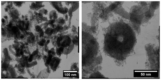 According to TEM data, composite powders MCM-HA and MCM-HAFe2 each consist of two fractions: structured silicate and apatite powders (Figure 4). The particle shape of the composite materials did not change with the increasing iron content and was flake-like and lamellar [54]; the particle size diminished somewhat (from 50–40 to 20 nm) with the elevation of iron concentration. Dark zones belonging to MCM-41 are present in micrographs.