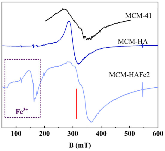 The pure HA sample, just as the mesoporous MCM-41 material, is paramagnetically pure, and no EPR spectrum should be observed. A single broad resonance line at g = 4.3 for Fe3+ ions (100–150 mT) in MCM-HAFe2 and in the 300–400 mT region was detected in the studied samples; this outcome may be related to the presence of free radicals on the surface of the samples (Figure 7). The obtained EPR spectra were explained by isotropic interaction and the presence of strong zero-field splitting for Fe3+ ions owing to the influence of a local crystal field (an electric-field gradient) [47]. The high absorption capacity of the compounds leads to an increased concentration of carbonate radicals on the surface and causes a strong spin–spin interaction and homogeneous broadening of the resonance lines. The asymmetry of the EPR lines in the region g = 2.00 (B0 = 310 mT, the red line in Figure 7) is due to the anisotropy of spectroscopic splitting factor Δg = 0.02, indicating the partial incorporation of radicals into the crystal lattice.