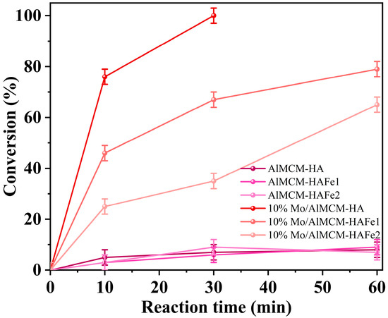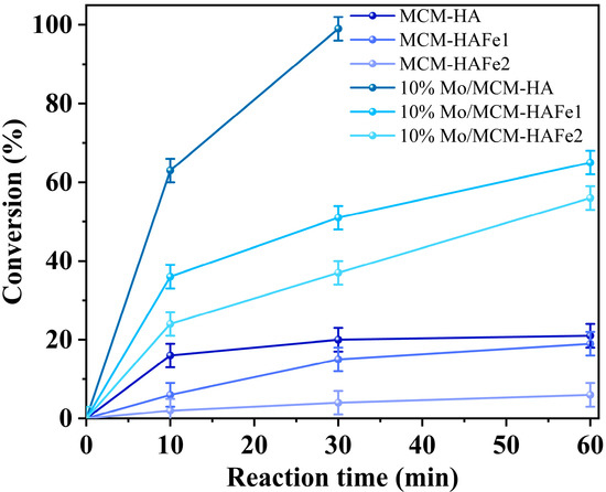 Figure 8 presents the results of the activity assay of the synthesized catalysts deposited on mesoporous silicate MCM-41. It should be noted that the catalysts representing HA deposited on the carrier (MCM-HA) with different iron concentrations manifested almost no catalytic activity. Namely, when these materials were employed, the kinetic curve reached a plateau corresponding to 20% conversion, which may be explained by both the idle adsorption of DBT in the pores of the carrier (which is 7%) and by the oxidation of DBT by hydrogen peroxide at 70 °C. According to the results, when the iron content of HA was increased, the conversion of DBT monotonically decreased. For example, the catalyst 10%Mo/MCM-HA achieved 100% conversion of DBT within 30 min of the reaction, whereas under similar conditions, the catalyst 10%Mo/MCM-HAFe1 helped to oxidize only half of the substrate; in the presence of the catalyst 10%Mo/MCM-HAFe2, the conversion was less than 40%.
