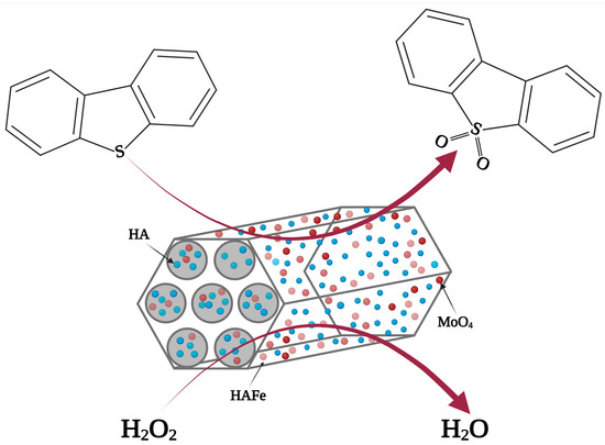 A major finding is an apparent enhancement of catalysis as a consequence of the molybdenum impregnation. It can be supposed that the role of HA is to bind molybdenum compounds and prevent their leaching in the presence of an aqueous hydrogen peroxide solution. Accordingly, low-cost composite catalysts were prepared, with the most efficient compositions being 10%Mo/MCM-HA and 10%Mo/AlMCM-HA and leading to 100% DBT conversion within 30 min at 70 °C. To our knowledge, this is the first investigation into the impact of MCM-41-HA composition on the conversion of DBT via oxidative desulfurization by means of hydrogen peroxide as an oxidant.