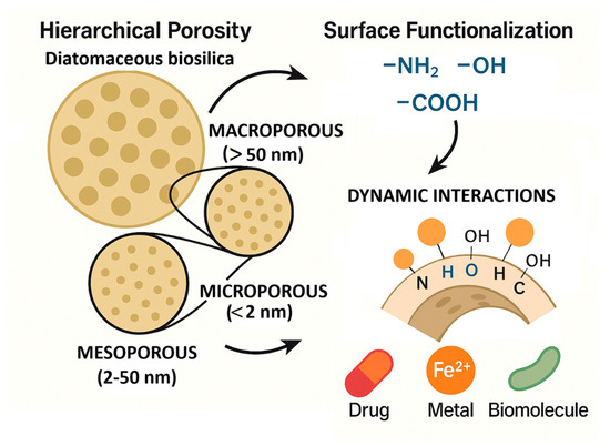 DB is formed through a biofabrication process, which involves the synthesis of silica through biological silicification. This process converts soluble silicate into amorphous silica, forming diatom cell walls with complex, highly ordered structures [3]. The biosilica is composed not only of amorphous silica but also of organic components, such as proteins and carbohydrates, which are responsible for the formation of the nano- and microporous architecture of the frustules [3]. These biopolymers’ templating and scaffolding activities are essential for creating the unique, highly organized pore structures found in diatom frustules (Figure 1). Figure 1 schematically illustrates the hierarchical porosity of diatom biosilica and highlights the potential strategies for surface functionalization, which further modulate the dynamic interactions with target molecules.