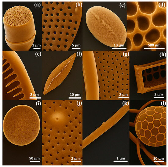 On the other hand, diatomaceous biosilica (DB) refers to the porous, amorphous silica (SiO2) derived from the cell walls of diatoms, a group of microalgae belonging to the class Bacillariophyceae. Diatoms are unicellular microalgae ubiquitous in aquatic environments that efficiently utilize solar energy in photosynthetic processes. This performance can be attributed to their intricate structure and the patterns of their silica-based exoskeleton [2], as illustrated in Figure 1.