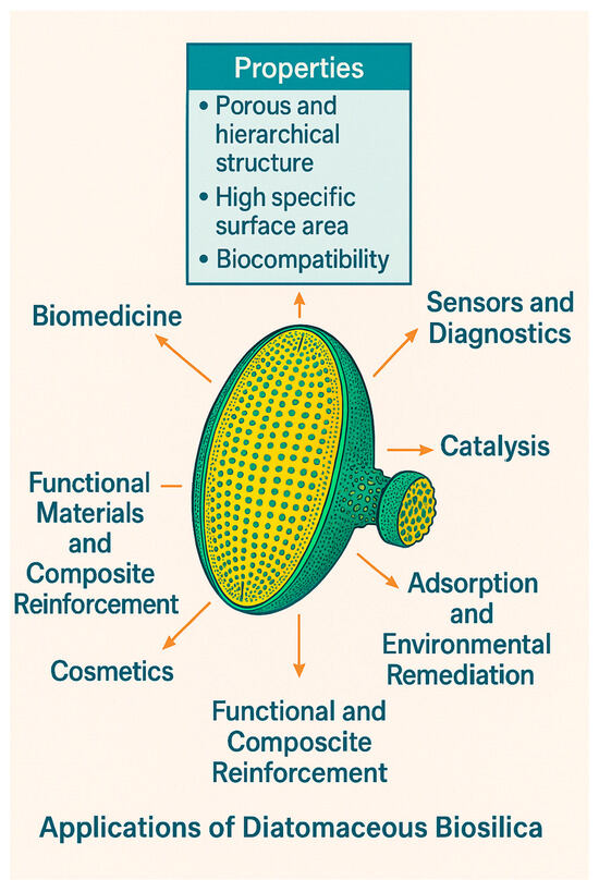 The intricate and highly porous structure of DB (Figure 2) offers unique optical and mechanical properties, contributing to the diatom’s efficiency in photosynthesis and its resistance to predators [3]. The layered, porous structure of DB also plays a critical role in nutrient separation, filtration, and the elimination of harmful microorganisms. The structural complexity of DB, which cannot currently be replicated by artificial synthesis, further highlights its potential applications in a variety of fields (see Figure 3). Its biocompatibility, tunable surface chemistry, and cost-effective production make it an attractive alternative to synthetic silica in various high-tech applications [6] and, thus, has great potential in biotechnology applications.