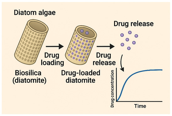 In the biomedical field, diatomaceous biosilica shows great potential as a matrix for controlled drug release and the development of advanced biomaterials. Its porosity allows the incorporation of therapeutic agents that can be released gradually and locally, increasing treatment efficacy and reducing adverse effects; Figure 4. Aw et al. [92] used porous silica microparticles derived from fossilized diatoms, known as diatomaceous earth (DE), which have been investigated as natural carriers for controlled drug release. Indomethacin, a model drug with low water-soluble content, was used to evaluate the incorporation and release capacity. The results demonstrated a loading capacity of 22% by weight and sustained release for up to two weeks. The profile presented two phases: a rapid initial release (up to 6 h) and a slow and continuous release associated with the internal porous structure of the frustules.