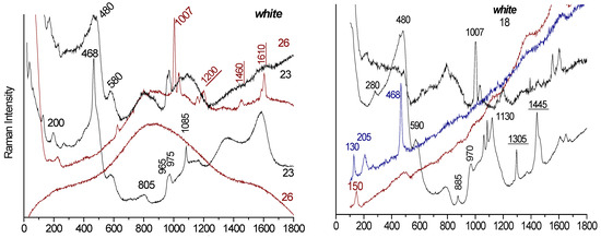 The main quartz peak at ~462 cm−1 [39] may shift slightly due to stresses in the glassy matrix. In the presence of pink malayaite pigment, green laser excitation may cause resonant enhancement of Sn-Cr chromophore modes (e.g., peaks at 745 and 940 cm−1, see Figure 6) [28].