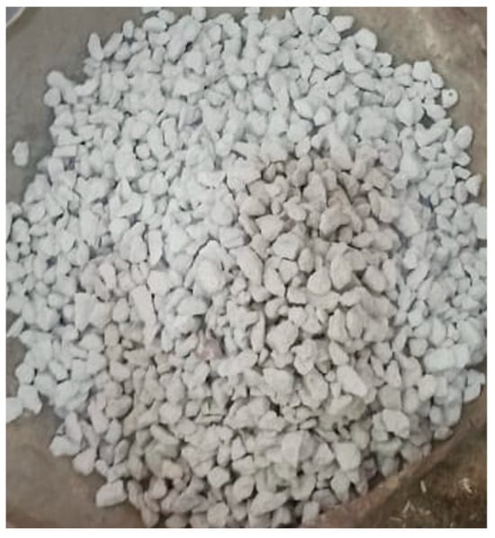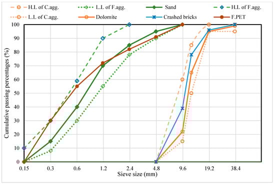 Crushed dolomite (D) and sand (S) were used as a natural coarse and fine aggregate, and crushed lightweight bricks (CB) were used as a lightweight coarse aggregate. These bricks were gathered and subsequently crushed in the lab to produce brick aggregates, as shown in Figure 3. The bricks were manually crushed, then sifted into different size categories, with flaky particles removed. The chemical and physical properties of D, S, and CB are illustrated in Table 2 and Table 3. Minced plastic waste bottles (F-PET), made of polyethylene terephthalate, were used as a lightweight fine aggregate. The PET was gathered from the Mahta landfills in Kafr Elsheikh and thoroughly cleaned to eliminate contaminants. It is important to note that PET is commonly used worldwide to manufacture plastic water bottles, and the PET sourced from Kafr Elsheikh does not differ significantly from that of other regions. Recycled plastic aggregate was created by melting PET at its melting point of 255 °C. The molten PET was then poured onto a tray containing fine aggregate, with additional fine aggregate spread on top, as shown in Figure 4. Figure 5 illustrates the grading curve of the aggregates in relation to the lower and upper limits for fine aggregates (L.L of F.agg., H.L of F.agg.) and coarse aggregates (L.L of C.agg., H.L of C.agg.). It is important to note that all fine and coarse aggregates, such as sand, dolomite, and crushed brick, were employed in a saturated-surface-dry state.