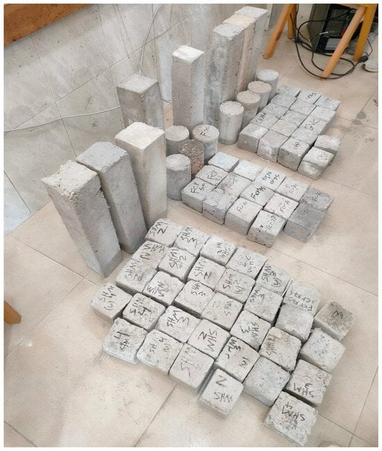 The mixtures were prepared using a procedure similar to that of conventional concrete production. Initially, 80% of the alkaline activator solution was blended with the binder materials, followed by the incorporation of both coarse and fine aggregates. The fly ash and aggregates were first dry-mixed in a pan mixer for two minutes. Subsequently, the alkaline solution was added and mixed for five minutes to ensure uniform dispersion and homogeneity of the paste. The remaining 20% of the alkaline solution was combined with the bacterial solution and then added to the mixture, followed by an additional two minutes of mixing to ensure even distribution. After mixing, the fresh concrete was cast into molds with dimensions of 100 × 100 × 100 mm (cubes), 100 × 150 mm (cylinders), and 100 × 100 × 500 mm (beams), as illustrated in Figure 6. The samples were allowed to set for 24 h. After this initial period, the specimens were demolded and subjected to ambient curing for 28 days to facilitate compressive strength testing, in accordance with IS 456:2000 guidelines. All specimens were cured at room temperature without the application of external heat or oven curing.