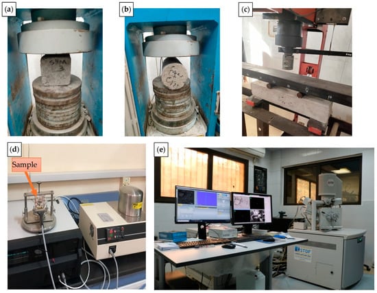 Experimental photos of (a) compressive, (b) tensile, and (c) flexural strengths, (d) thermal transport parameters, and (e) analyzing microstructures tests.