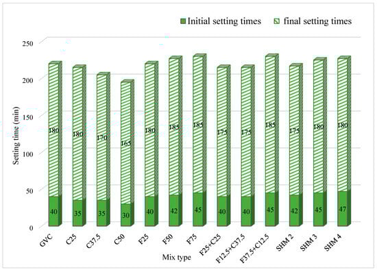 At a 25% replacement level, F-PET had no significant effect on either slump or setting times. However, as the replacement level increased to 50% and 75%, modest enhancements were noted. These changes are primarily attributed to the spherical morphology and smooth surface texture of F-PET particles, which reduce internal friction within the mix compared to natural sand, thereby facilitating improved flow and delaying setting. The lower surface roughness and angularity of F-PET particles minimize mechanical interlocking, contributing to extended workability. These findings align with the results reported by Choi et al. [56], who similarly observed enhanced workability and slightly delayed setting times in concrete mixtures incorporating recycled PET aggregates.