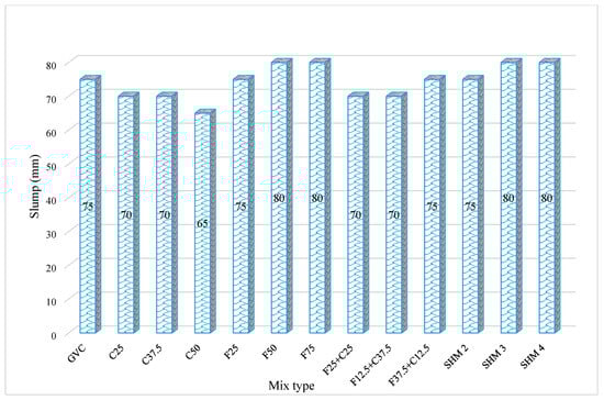 Conversely, the replacement of sand with fine polyethylene terephthalate (F-PET) at levels of 25%, 50%, and 75% led to increases in the initial setting time (IS) by 0%, 5%, and 12.5%, respectively, and in the final setting time (FS) by 0%, 2.8%, and 2.8%, respectively. Similarly, the slump height exhibited slight increases of 0%, 6.7%, and 6.7%, respectively, with increasing F-PET content. The trends observed in Figure 8 and Figure 9 demonstrate that higher F-PET incorporation is associated with slight improvements in workability and delayed setting times.