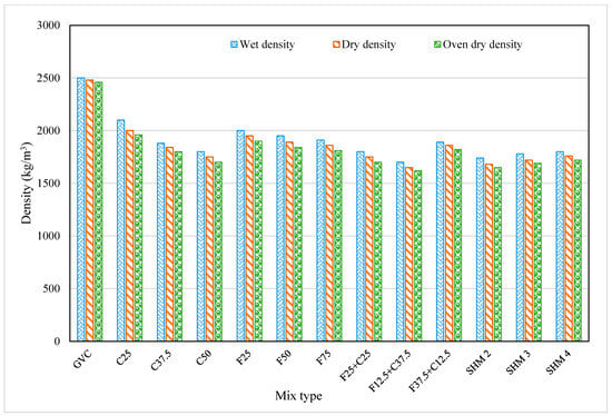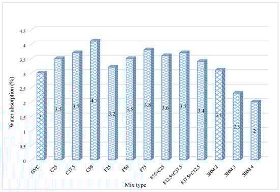 Moreover, mixtures combining both CB and F-PET demonstrated the lowest densities across all conditions, exceeding the reductions achieved by individual substitutions. The mixture F12.5+C37.5 was identified as the lightest formulation, with densities of 1700 kg/m3 (fresh), 1650 kg/m3 (hardened), and 1620 kg/m3 (oven-dry). These significant reductions are primarily attributed to the lower specific gravity of CB and the inherently low density of F-PET, as supported by previous studies [56,58]. The inclusion of self-healing bacteria at 2%, 3%, and 4% concentrations contributed to a gradual increase in all density states. Specifically, the fresh densities increased to 1740, 1780, and 1800 kg/m3, the hardened densities to 1680, 1720, and 1760 kg/m3, and the oven-dry densities to 1650, 1690, and 1720 kg/m3, respectively. These outcomes are in agreement with the observations reported by Buller et al. [59], suggesting that bacterial incorporation may lead to the formation of denser internal microstructures through biomineralization processes, thereby slightly enhancing the composite’s overall density.