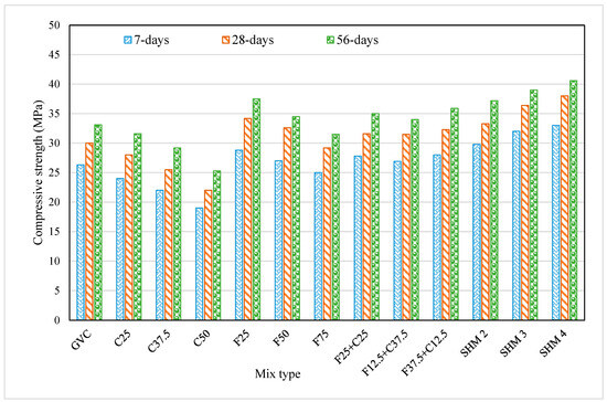 These reductions align with earlier findings [60,61], which reported diminished compressive strength when CB was employed as a partial or full substitute for natural coarse aggregates. The performance deterioration is often attributed to the porous nature and lower mechanical integrity of CB particles, which may compromise the load-bearing efficiency of the matrix and contribute to higher water absorption and weaker interfacial bonding. Nevertheless, it is important to note that under certain conditions, such as optimized mix designs or enhanced curing regimes, some studies [62] have reported improved compressive strength for concrete containing broken brick, possibly due to better matrix densification or pozzolanic reactivity from finely ground brick particles.