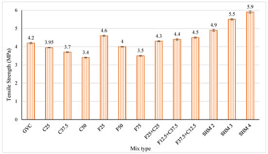 Additionally, the mass-to-volume ratio of F-PET compared to sand causes a higher number of PET particles to be introduced at the same volumetric replacement, exacerbating dispersion challenges and further weakening tensile cohesion. Among the hybrid mixes, the 25% CB + 25% F-PET combination achieved a 9.5% increase in ft, while the 12.5% CB + 37.5% F-PET mix showed a 7.1% increase, both benefiting from the complementary physical characteristics of the two materials. In contrast, the 37.5% CB + 12.5% F-PET mix, despite achieving the lowest density, exhibited an ft 2.4% lower than GVC, suggesting that density reductions do not always correlate with strength improvements, particularly when coarse aggregate replacement dominates. The tensile strength gains observed with low F-PET contents are primarily linked to the enhanced ductility, soft surface texture, and reduced internal friction provided by PET particles, which improve crack bridging and strain distribution within the matrix [66].