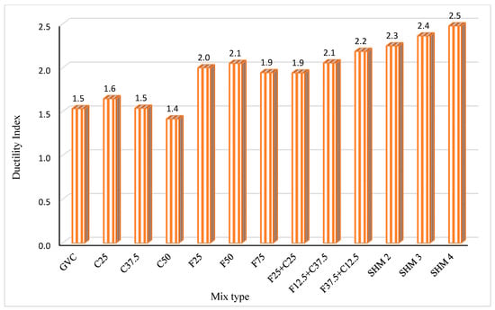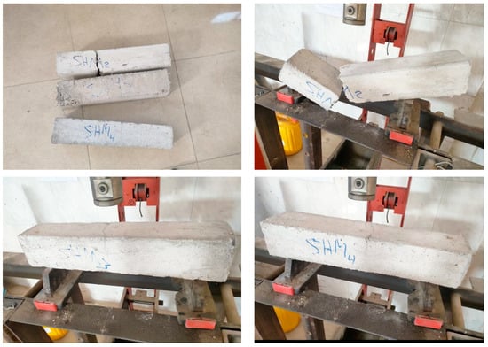 However, increasing F-PET content to 75% led to reductions in Δbi, Δbu, and DI, in agreement with the observed deterioration in flexural strength. These trends align with previous findings by Sabar and Dawood [69]. The combined use of CB and F-PET produced favorable effects on deflection behavior and ductility. Notably, the F37.5 + C12.5 mix demonstrated the highest ductility, showing the best balance between strength and deformability among all tested mixes. This synergistic effect can be attributed to the complementary roles of CB (enhancing mechanical interlocking) and F-PET (enhancing flexibility and crack distribution control). Furthermore, the addition of self-healing microorganisms (SHM) significantly enhanced Δbi, Δbu, and DI. Increasing the SHM content to 4% led to the most pronounced improvements, with Δbi, Δbu, and DI increasing by 53%, 147.8%, and 61.6%, respectively, compared to the reference mix. These enhancements are linked to the microbially induced calcium carbonate precipitation (MICP), which seals microcracks and reinforces the matrix, thereby improving both flexural strength and postcracking ductility [70]. The failure modes, illustrated in Figure 16, confirm these findings. Specimens with 3% and 4% SHM exhibited more distributed cracking patterns and delayed failure, indicating improved energy dissipation and higher ductility, in line with the increased DI values observed.