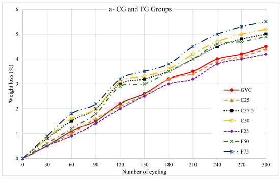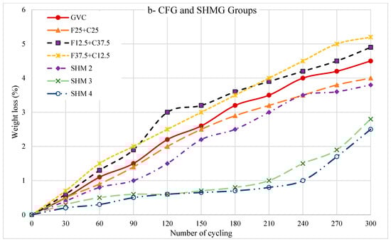 Water absorption and freeze–thaw resistance tests were conducted at 28 days, in accordance with ASTM C1585-13 and ASTM C666/C666M-15 [53,54], respectively. For the freeze–thaw test, the freezing temperature range was maintained between −23 °C and −20 °C, while the thawing temperature range was maintained between 8 °C and 10 °C. Each freeze–thaw cycle was completed within 2 to 4 h, with the thawing phase comprising at least 25% of the total cycle duration. The transition time between freezing and thawing phases did not exceed 10 min. Concrete specimens were removed from the curing chamber and maintained under controlled temperature and humidity conditions, and their initial weight, length, and height were recorded. The specimens were then placed in a freeze–thaw testing apparatus compliant with ASTM standards and subjected to repeated cycles as specified. Upon completion of the designated number of cycles, each specimen was retrieved from the apparatus, and its weight, length, and height were remeasured. These values, along with mass loss, were documented. Additionally, specimens were visually inspected for surface deterioration or crack formation after each cycle. Weight loss (WL%) and relative dynamic modulus of elasticity (RDME%) were calculated to assess durability. WL% was determined using the following formula: