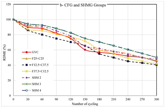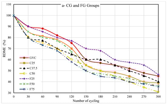 RDME%, representing the ratio of dynamic modulus of elasticity after freeze–thaw cycles (DMEn) to the initial value (DMEi), was calculated using the following equation: