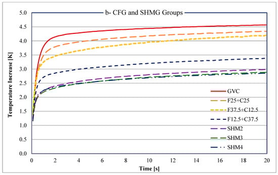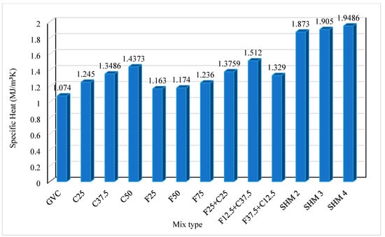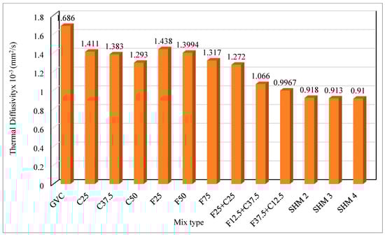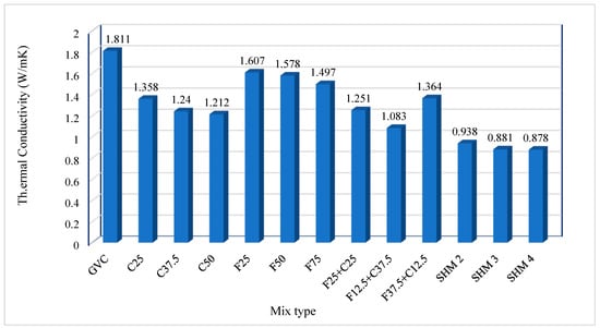 The CB group (CG) consists of three mixtures in which dolomite is replaced with 25%, 37.5%, and 50% CB, as in mixes C25, C37.5, and C50. On the other hand, the F-PET group (FG) contains three mixtures in which sand is replaced with 25%, 50% and 75% F-PET as in mixes (F25, F50, and F75). The third group (CFG) incorporates both CB and F-PET with a total replacement percentage of 50% in three different ratios. The final group, the self-healing mix group (SHMG), includes three mixes that have 2%, 3%, and 4% SHM added to the optional mix F12.5+C37.5. This optimized mix was selected due to its lowest density, reduced thermal conductivity, and other favorable performance characteristics.