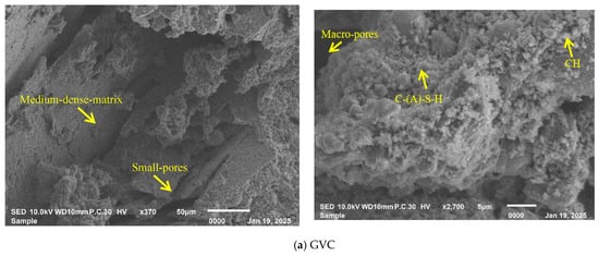 The compressive strengths of self-healing geopolymer (SHG) mixes incorporating various proportions of crushed brick (CB), fine PET (F-PET), or both, along with different dosages of self-healing microorganisms (SHM), were evaluated at 7, 28, and 56 days and compared with the geopolymer reference concrete (GVC), as presented in Figure 11. The compressive strengths of GVC at these respective ages were 26.3 MPa, 31 MPa, and 31 MPa. The replacement of dolomite with 25%, 37.5%, and 50% CB consistently led to declines in compressive strength across all tested ages. The magnitude of reduction increased with higher CB content. For instance, a 37.5% CB replacement resulted in compressive strength decreases of 24.0%, 21.7%, and 23.6% at 7, 28, and 56 days, respectively. A 50% CB replacement further reduced strength by 28.0%, 27.0%, and 24.0% at the corresponding ages.