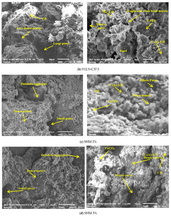 Scanning Electron Microscopy (SEM) analyses revealed no evidence of new mineral phases or chemical interactions between crushed brick (CB), fine PET (F-PET), and the geopolymer matrix. Consequently, the observed improvements in compressive strength are attributed to physical synergy and enhanced microstructural configuration rather than chemical bonding mechanisms. Among the combined aggregate substitutions, the mix incorporating 25% CB and 25% F-PET exhibited compressive strength increases of 5.6%, 5.3%, and 5.7% at 7, 28, and 56 days, respectively. The 37.5% CB + 12.5% F-PET mixture resulted in improvements of 2.2%, 5%, and 2.7%, while the 12.5% CB + 37.5% F-PET mix achieved the highest gains across all tested blended mixes, with increases of 7.1%, 11%, and 12.4% at the same respective intervals. These findings identify F37.5+C12.5 as the optimum mixture in terms of compressive strength, whereas F12.5+C37.5, despite slightly lower strength, attained the lowest density, qualifying it as a lightweight concrete. These trends align with previous investigations by Rahmani et al. [66] and Dawood et al. [67], which emphasized the effectiveness of low-percentage PET replacements in enhancing mechanical performance.