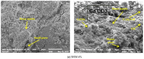 Moreover, the addition of 2%, 3%, and 4% SHM to the F37.5 + C12.5 mix yielded substantial gains in both fbi and fbu. Specifically, fbi increased by 38%, 67%, and 100%, and fbu rose by 33%, 61%, and 81%, respectively. These improvements are attributed to bacteria-induced calcium carbonate precipitation, which enhances microstructural integrity and actively heals microcracks within the matrix. The presence of moisture initiates bacterial metabolic activity, promoting gradual autogenous healing and matrix densification over time. These findings are consistent with prior research by Buller et al. [59] and support the observed enhancements across other mechanical properties, including compressive and tensile strengths.