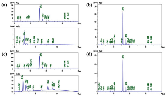 In the elemental analysis (Figure 1a), before being filtered, the composition of the ZrO2 nanostructures consists mainly of S, Zr, and P, aside from minor remnants of the alloy (Hf, Ca, and Cs). Likewise, the oxide analysis showed mainly SO3, ZrO2, and HfO2 (Figure 1b). This composition was expected and originates from complexes such as [ZrF6]2−, which are created during the formation of pores or tubes in Zr. As was explained in our previous work, ammonium sulfate and ammonium fluoride are crucial in the catchment and precipitation of Zr, thus the creation of nanotubes [3].