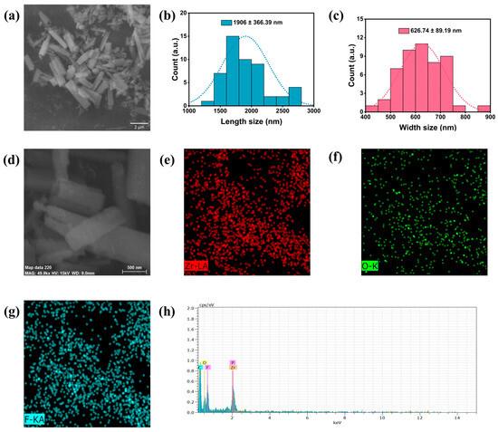 Based on what was captured in the micrograph (Figure 2a), the bar distribution tends to be uniform, with a width of 626.74 nm and a length of 1906.39 nm (Figure 2b,c). The size obtained solely from the synthesis is within the range of the formed structures found in processes such as chemical conversion coating [17,18,19]. The EDS characterization determined the composition by area and by mapping a zone with ZrO2 bars (Figure 2d–g). The bars show a Zr, O, and F composition, conjugating with the XRF analysis.