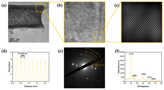 The TEM characterization confirmed that the by-products of the ZrO2 membrane synthesis are fragmented tubes, showing with greater detail the shape of the tube and wall thickness (Figure 3a). The micrographs captured by HR-TEM, SAED, and XRF (Figure 3b–f) all show that the nanostructures are made up of a cubic structure and detected an interplanar spacing of 0.23 nm in correspondence to the plane (200) [20]. Interestingly, this is the crystallinity of ZrO2 that requires the most energy in order to be obtained. However, due to the electrolyte and electrochemical parameters, the obtaining of this crystallinity was already shown in previous research [3,21].