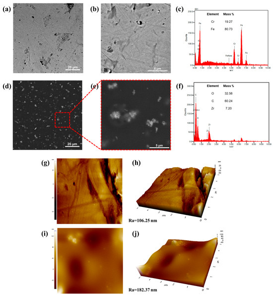Stainless steel characterization before and after the ZrO₂−PVA coating. (a) SEM micrograph of the stainless steel surface, (b) Stainless steel surface close-up, (c) EDS spectra of the metallic surface, (d) SEM micrograph of the ZrO₂−PVA coating, (e) Close−up of the coated surface, (f) EDS spectra of the coated surface, (g) AFM image of the metallic surface, (h) 3D image of the metallic surface, (i) AFM image of the coated surface, and (j) 3D image of the coated surface.