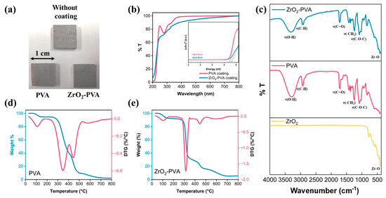 Comparison between PVA and ZrO₂−PVA coatings. (a) Visual inspection of the coated and uncoated steel, (b) Transmission of the UV−Vis spectra and Tauc plot, (c) FTIR spectra of ZrO2 and coatings, (d) PVA coating TGA−DTG, and (e) ZrO₂−PVA coating TGA−DTG.