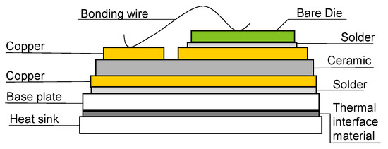 The structure of a conventional wire-bonded power module is depicted in Figure 1. A copper–ceramic substrate as circuit carrier is in the middle, ensuring both the mechanical strength and the thermal management of the module, while the bare dies are usually attached with solder and bonding wires [9].