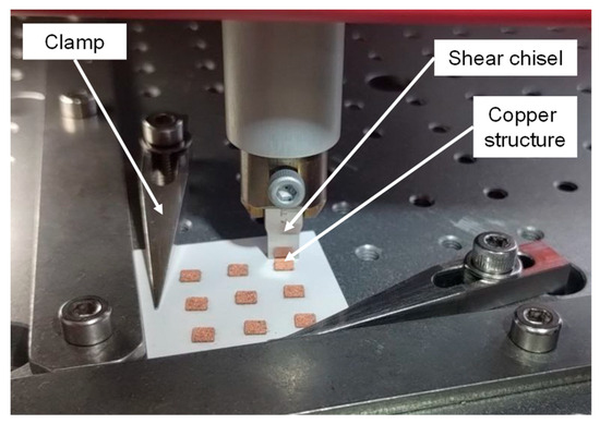To assess the adhesion, shear testing is conducted according to DIN EN 15340 [31]. An XYZTec Condor Sigma (Panningen, The Netherlands) machine is used with a 5 mm shear chisel, a shear height of 0.05 mm, and a shear speed of 0.05 mm/s. The tested Cu structures have dimensions of 3 mm × 3 mm × 0.36 mm. Figure 3 shows the shear testing arrangement for this study.