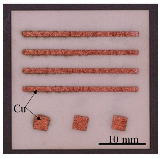 Previous studies in this context include the powder bed fusion of pure copper [18,19,20,21,22], the application of Cu powder on Al2O3 substrates, including the usage of diverse laser wavelengths [8,9,23], and the integration of titanium (Ti)-containing powder to enhance material bonding and increase mechanical properties [24,25,26]. Concerning AlN and PBF-LB/M, Al alloy powder on AlN has been investigated [27].