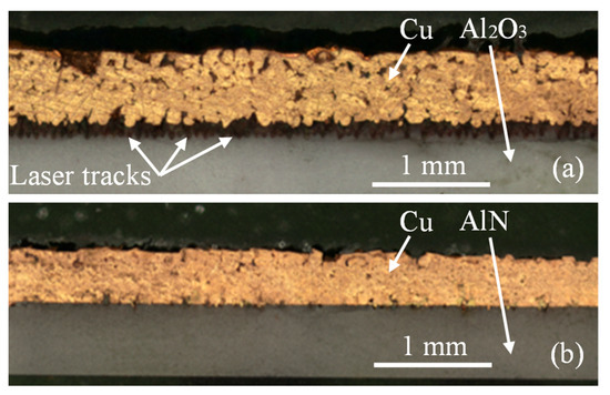 Cross-sections of PBF-LB/M-manufactured Cu on Al2O3 (a) and AlN (b) substrates.