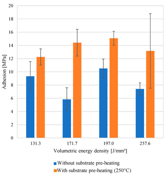 To calculate the , = 30 µm is always used; this simplification may be justified by referring to Figure 7, where the layer height is considered the least relevant factor with regard to adhesion. With pre-heating (orange bars in Figure 9), neither a very high nor a very low results in the maximum adhesion. Too little energy prevents the powder from interlocking with the ceramic surface, whereas too high energy damages the surface rather than creates an interface. Also in [9], a trend is observed, which includes a rise in adhesion when increases up to a maximum point, after which a decrease in adhesion occurs with further increases in starting again, so the best adhesion values are reached with medium values. The fracture codes showed mostly adhesion fractures with some cohesive shares.